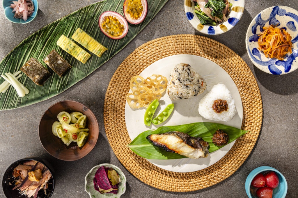 やちむんの器に盛られた料理は、沖縄の自然と静かに調和し、まるでその風景の一部であるかのように、空間に溶け込みます。